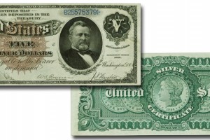 Among the notes offered by Stack’s Bowers Galleries Whitman Baltimore Winter Expo official currency auction, you’ll find this stunning Fr. 263 1886 $5 “Silver Dollar Back” Silver Certificate, as well as other high grade United States large size type notes.