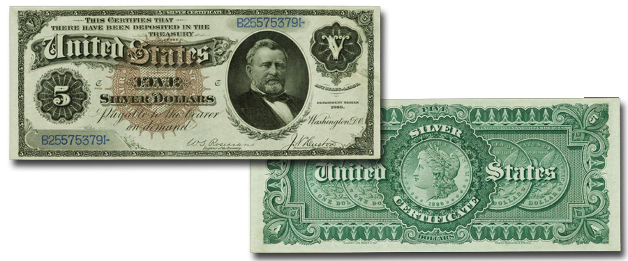 These “Silver Dollar Back” notes are so named for the five Morgan silver dollars seen on the ornate green printed back design, a single 1886 dated Morgan with the obverse facing up at center flanked on each side with two Morgans with the reverse facing up. The face of the note features the portrait of President Ulysses S. Grant to the right of center. Fr.263s feature a large brown spiked Treasury seal and the engraved signatures of Treasury officials Rosecrans and Huston.