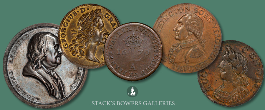 Finally, Washingtoniana will be featured and include over 275 lots of rare and significant coins, tokens, medals, and buttons related to George Washington, focused mainly on issues from the 18th and 19th centuries, as well as select items from the first decades of the 20th century.