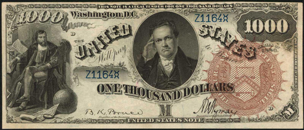 According to the cataloger, “just four examples of the 1862 and 1863-dated $1,000 Legal Tender Notes are known to collectors, with only two in private hands, this being the finest graded.”