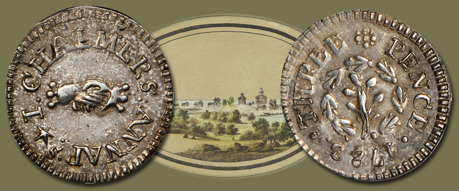 Annapolis, Maryland silversmith John Chalmers produced silver threepence, sixpence and shillings, the dies for which seem to have been engraved by Thomas Sparrow, who also engraved plates for Maryland paper currency.