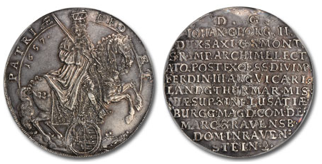 Today’s coin is a 2 Taler from the Albertine Line from the state of Saxony in Germany. Housed in an extra large NGC holder, this piece is truly impressive. It is a classic Vicariat issue that commemorates the death of Emperor Ferdinand III. Issued by Johann Georg II (1656-1680) – an adept statesman who successfully maneuvered his state so that Austria and France competed for influence – this hefty Taler displays an intricate design and is artistically executed. The obverse design features a magnificent figure of the Duke-Elector in a lavish robe and drawn sword atop a horse facing right. The arms for the region appear just below the horse in a cartouche oval. The legend states “Deo et Patriae” (For God and Fatherland) and the date of 1657. The reverse features a 12-line Latin inscription that records Emperor Ferdinand III’s death, and lists the full titles of the Vicar-Duke-Elector. An acorn appears at the very end of the legend, serving as the mintmark.