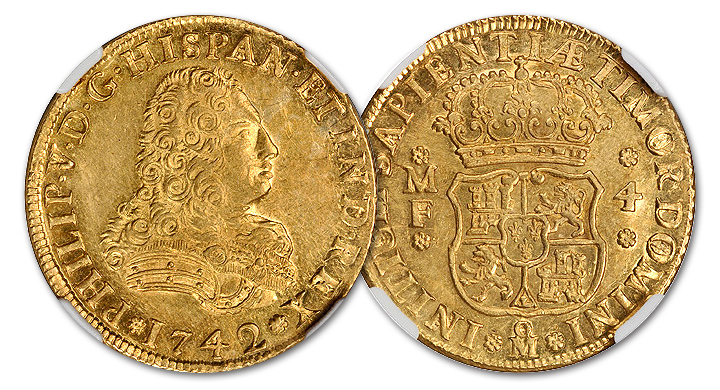 As is typical of Stack’s Bowers Galleries sales, there will be concentrations of highly desirable coinage in multiple areas. Gold Spanish Colonial coinage will be well represented, with 8 Escudos pieces from Bolivia, Chile, Colombia, Mexico and Peru all attracting bids. Other notable gold coins include a rare 1869-R Guatemala 16 Peso coin graded by NGC as MS-61, an almost impossible coin to locate especially in high grade, as well as a massive 1688 Great Britain 5 Guinea struck for James II. Additionally, there is an enormous offering of French gold coinage, beginning with coins from the early 18th century and from nearly every decade of the 19th century. Individual gold coins worthy of mention include a Scottish gold Rider (1475-83) struck for James III in VF-30 and without impairment, as well as a 1742-MF Mexico 4 Escudos, graded MS-61 by NGC and the only example ever seen at the grading services.