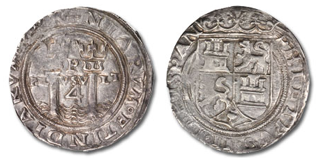 The Stack’s Bowers Galleries Official Auction of the Whitman Coin & Collectibles Baltimore Expo has a great number of numismatic treasures, including today’s preview coin, a rare Philip II 4 Reales from the very beginning of Spanish colonial coinage for Peru. Lima, sometimes considered the most aristocratic colonial capital, was the site of a new mint authorized in 1565, producing the first series of coinage in 1568. The mint in Lima operated sporadically, with sometimes decades in between mintages.